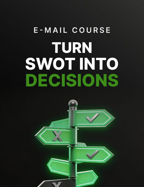 Email course designed to help you guide your customers through turning SWOT analysis into clear business decisions while upselling your offering.